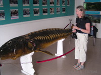 Margaret and a stuffed chinese sturgeon |